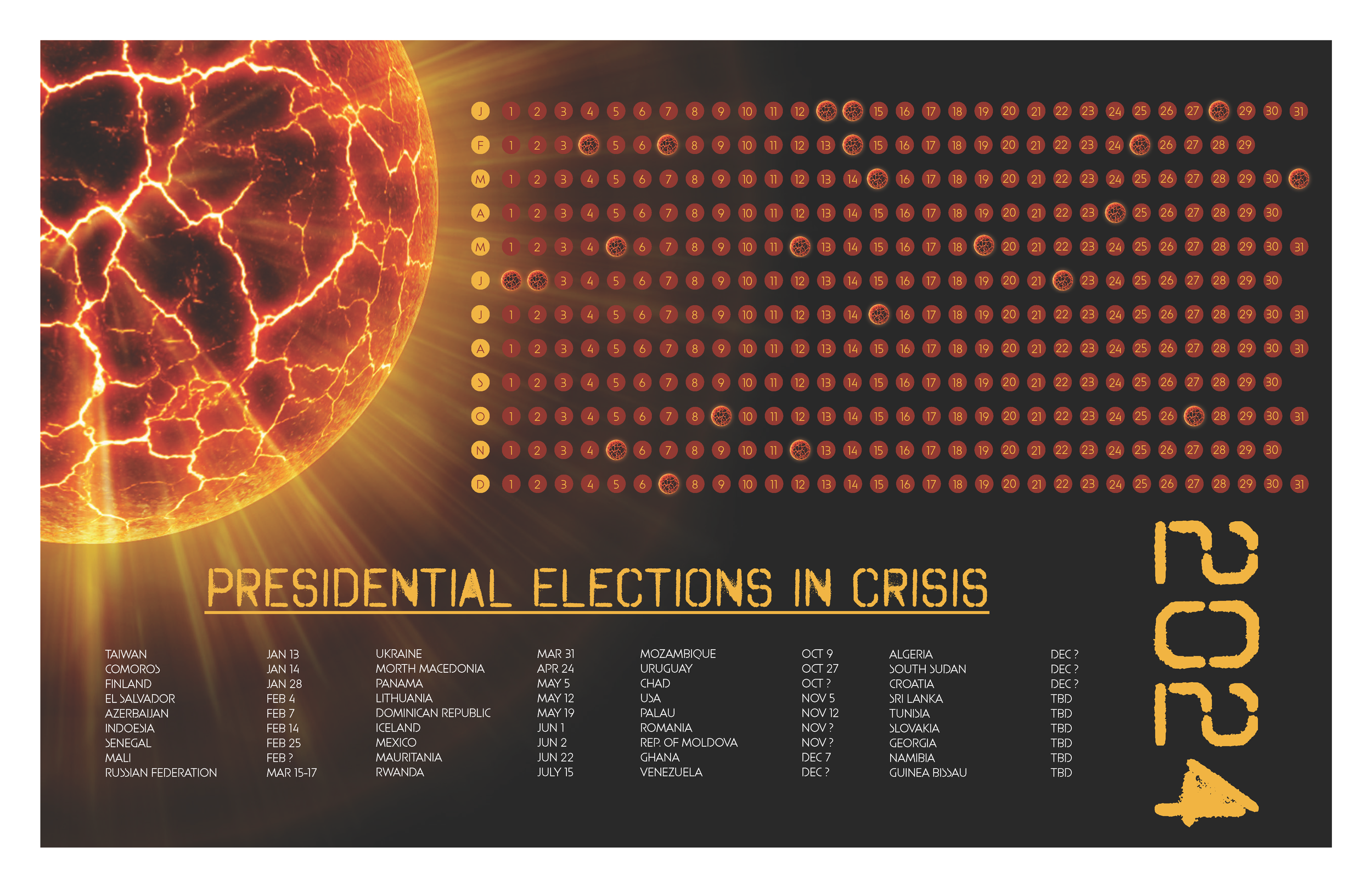 Presidential Elections in Crisis is a conceptual calendar illustrating the unprecedented number of global elections taking place in 2024. The design visualizes a year defined by political tension and volatility, using an imploding Earth as a metaphor for the instability surrounding democratic transitions worldwide. Each date corresponds to a nation’s election, transforming a typical calendar format into a visual map of global uncertainty and political shift.