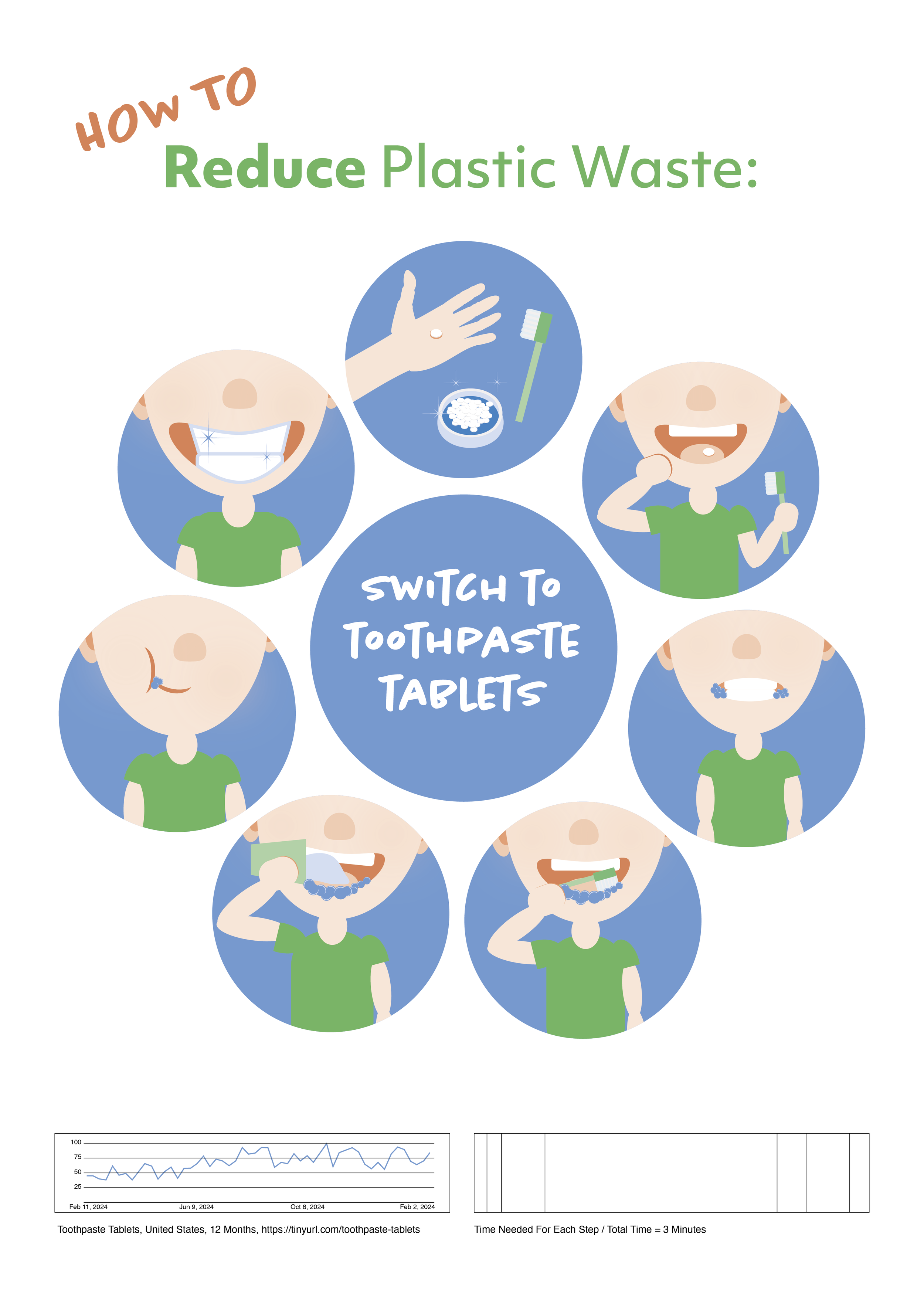 How to Reduce Plastic Waste is an illustrated infographic that encourages sustainable habits through playful design and simple storytelling. The piece introduces the shift from traditional toothpaste tubes to eco-friendly toothpaste tablets, highlighting how small, everyday choices can collectively create meaningful environmental impact. Approachable visuals and soft isometric illustrations make the message feel friendly and accessible, while the optimistic color palette and expressive character design reinforce a sense of empowerment and positive change.