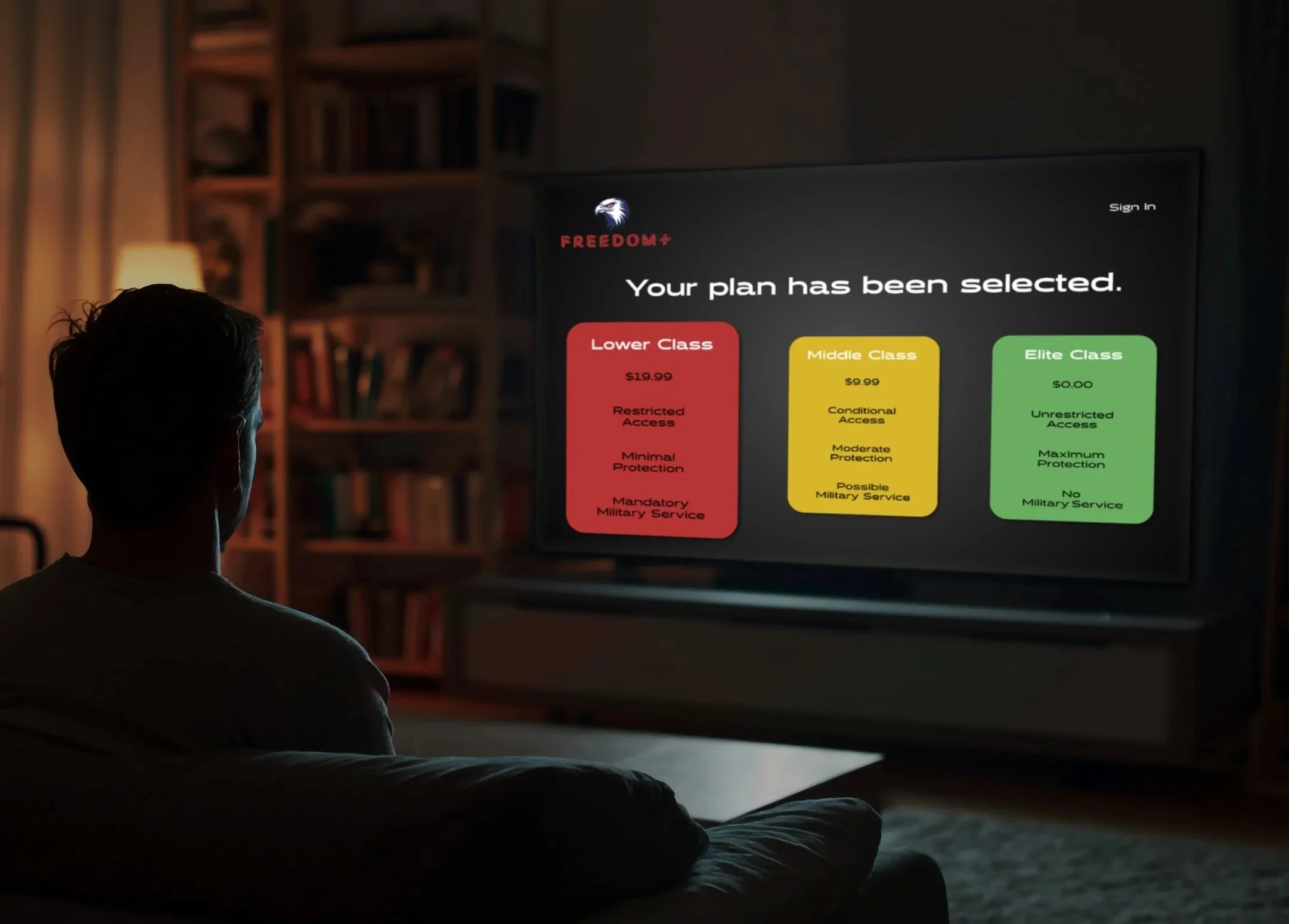 The primary interface mimics the visual language of services like Netflix, with clean layouts, tiered plans, and guided onboarding, to create an immediate sense of familiarity. However, instead of choosing a plan, users are assigned one based on class. Each tier—Lower Class, Middle Class, and Elite reflects a different level of access, protection, and risk. The lowest tier carries the highest cost and the greatest burden, while the Elite tier offers maximum access at no cost, exposing an inverted system of value.