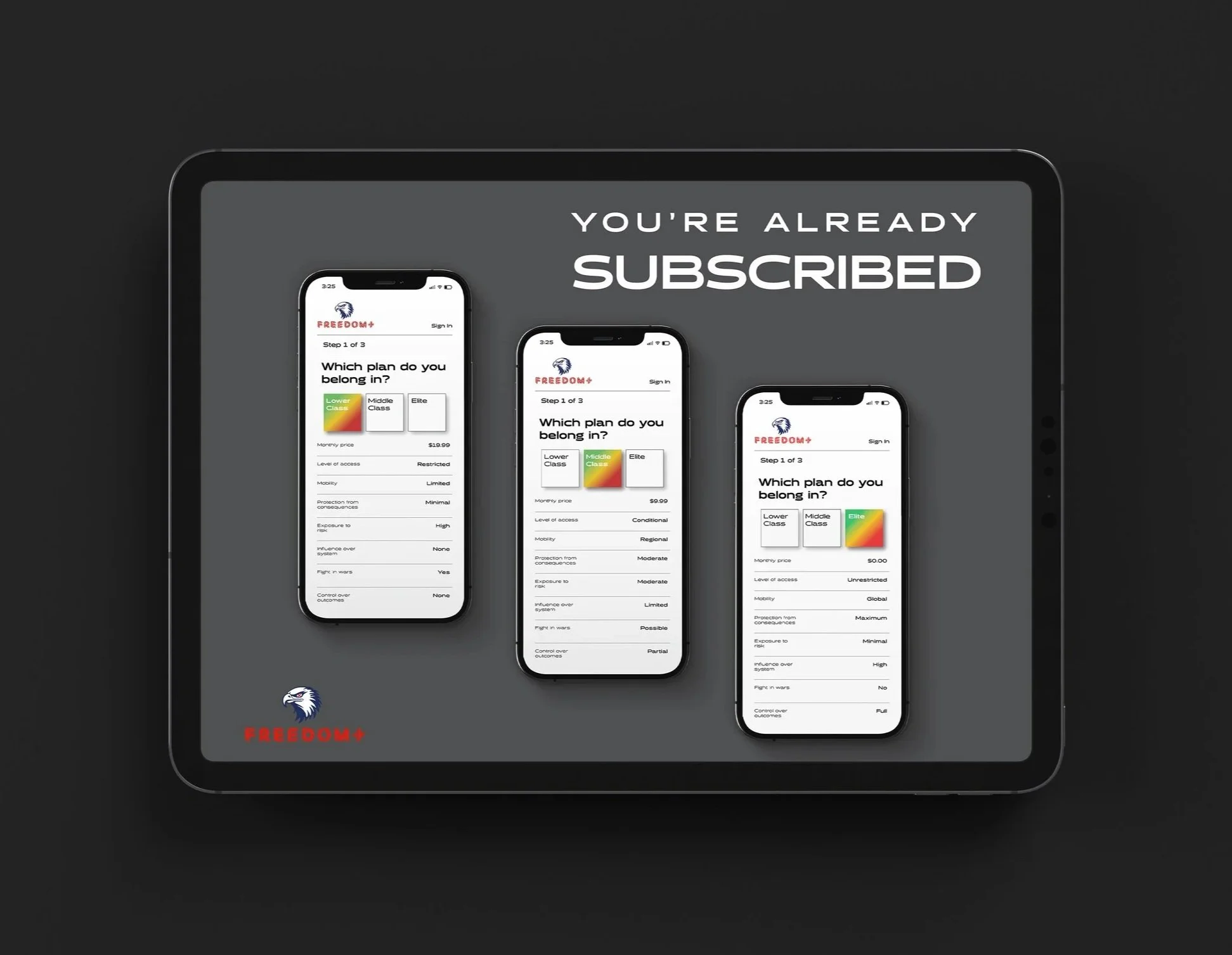 FREEDOM+ is a subversive design project that exposes the illusion of choice in systems where access is predetermined. While subscription platforms suggest choice and personalization, this project reframes that experience to reveal a system where outcomes are predetermined.