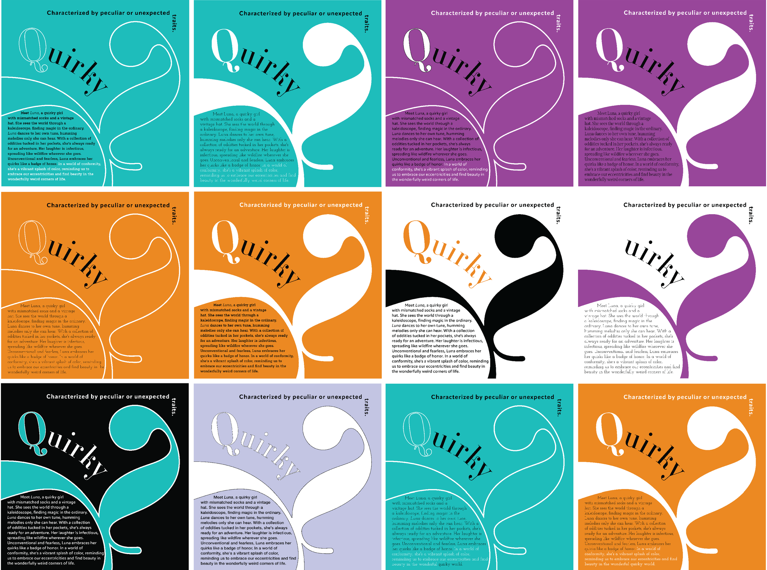This project began with designing a full set of abstract letterforms based on expressive shapes, exaggerated proportions, and playful visual rhythm. From the complete alphabet, I narrowed the collection to my strongest selections, then refined those into a final set of three letters. Each of these top forms was further developed through multiple iterations, focusing on stroke variation, personality, and balance. The final chosen letter became the foundation for Luna’s character, with her narrative built around the personality reflected in the design. The process included sketch exploration, form refinement, and experimentation with color and motion to align the typography with Luna’s imaginative world. All final artwork and compositions were developed using Adobe Illustrator and Adobe InDesign.